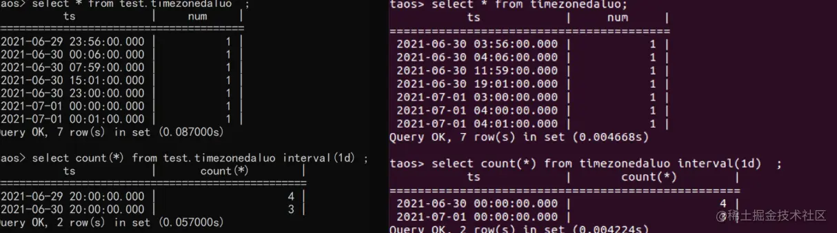 比如,左侧客户端count(*)看起来应该是1 4 2,实际上却是4和3。这就是因为两边时区不一致导致的视觉差异。这时候就要以服务端的显示为准:6月30日有4条数据,7月1日有3条数据——TDengine服务端所在服务器的查询结果,永远是所见即所得的正确。
