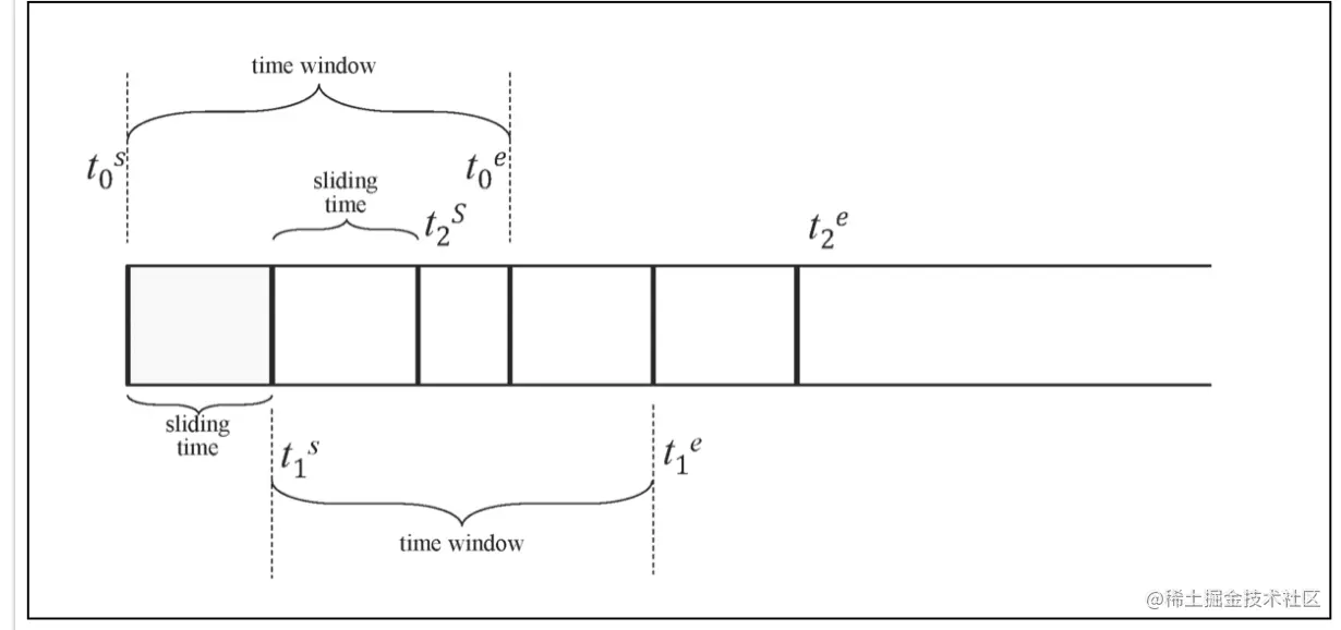 在上述计算过程中,SLIDING起到了非常关键的作用。我们已经知道,INTERVAL 的值负责指定每次执行查询的时间窗口。SLIDING则代表着指定窗口向前滑动的时间。如下图所示: