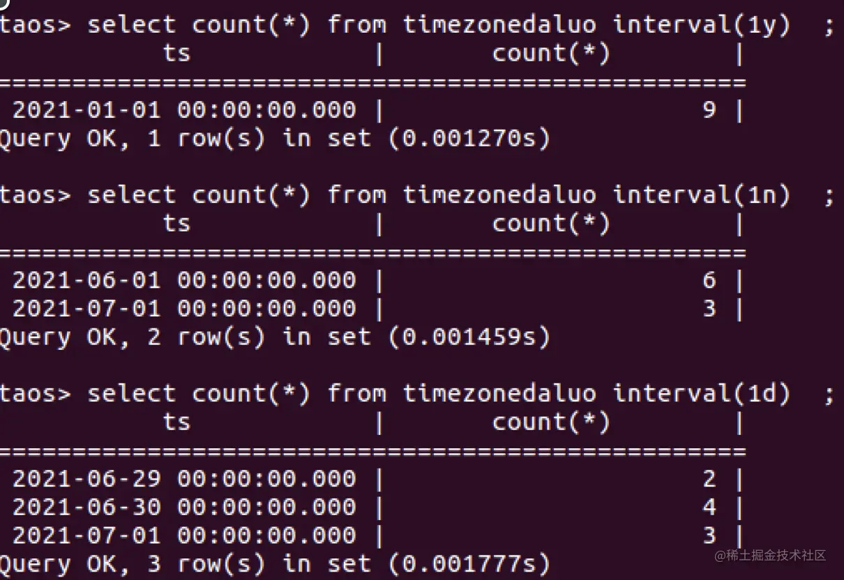 总结一下就是:TDengine以时间戳形式来存储时间数据,时间戳本身是一个和时区无关的东西,但是由于TDengine要把数据查询出来展示给世界上不同地区的用户看,就和时区有关系了。在INTERVAL中,如果是自然日,自然月,自然年,均以TDengine服务端所在时区的0点为起始时间进行时间窗口区分。如果是以h(小时)及以下为单位切分窗口,那么进行窗口切分的起始时间就是UTC时区的0点。