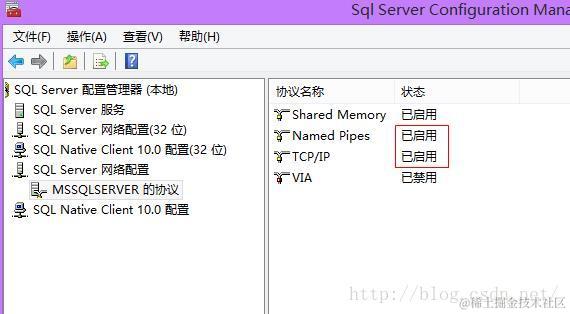 首先找到 SQL配置管理器>>>SQL Server网络配置>>>MSSQLSERVER的协议,把被禁用的Named Pipes、TCP/IP启用 如图1.3