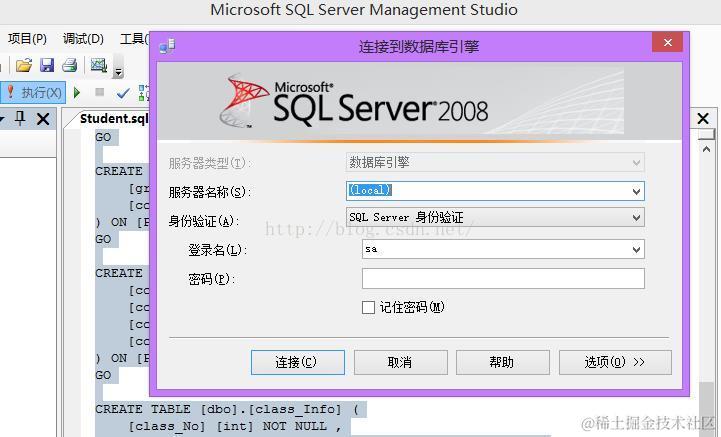 服务器名称选择“(local)” ——身份验证:SQL Server身份验证——登录名一般默认(此处的登录名和密码要和SQL模块代码中的SID和PWD一致,否则会导致连接成功但登录不上。)