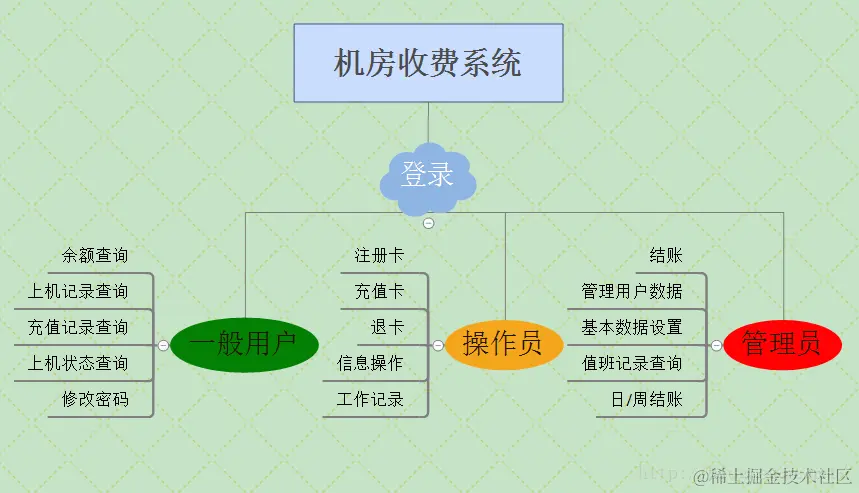 机房收费系统是我们接触的第一个没有源码的项目,这就是开始考验我们独立思考的阶段了。汲取了之前做学生信息管理系统的经验,这次开始之前就做了个全局的导图,方便过程中的知识梳理。