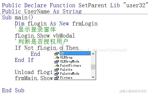 做一个名称为FrmLogin的登陆窗体,设置用户名、密码等,窗体定义一个公共变量OK As Boolean,当用户名、密码正确时,变量OK=True,否则OK=False