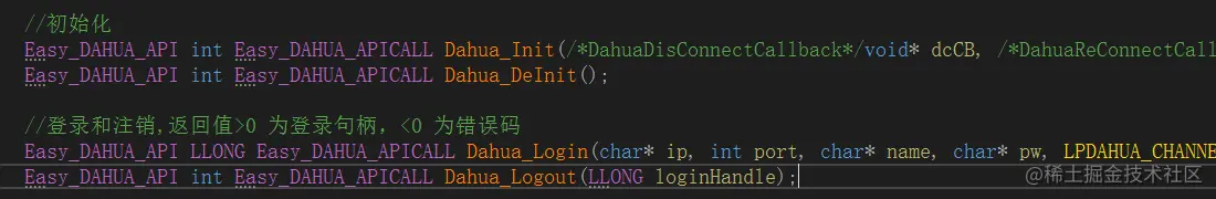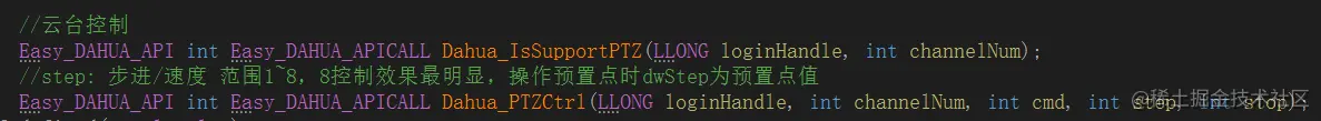 下面就需要集成到 EasyCVR 项目中。集成到 EasyCVR 项目中需要将大华 SDK 封装一层,方便 GO 语言调用。封装需要暴露几个接口给 GO 调用:初始化大华设备、释放 SDK 资源、登录大华设备、退出登录、是否支持云台控制和控制云台设备。