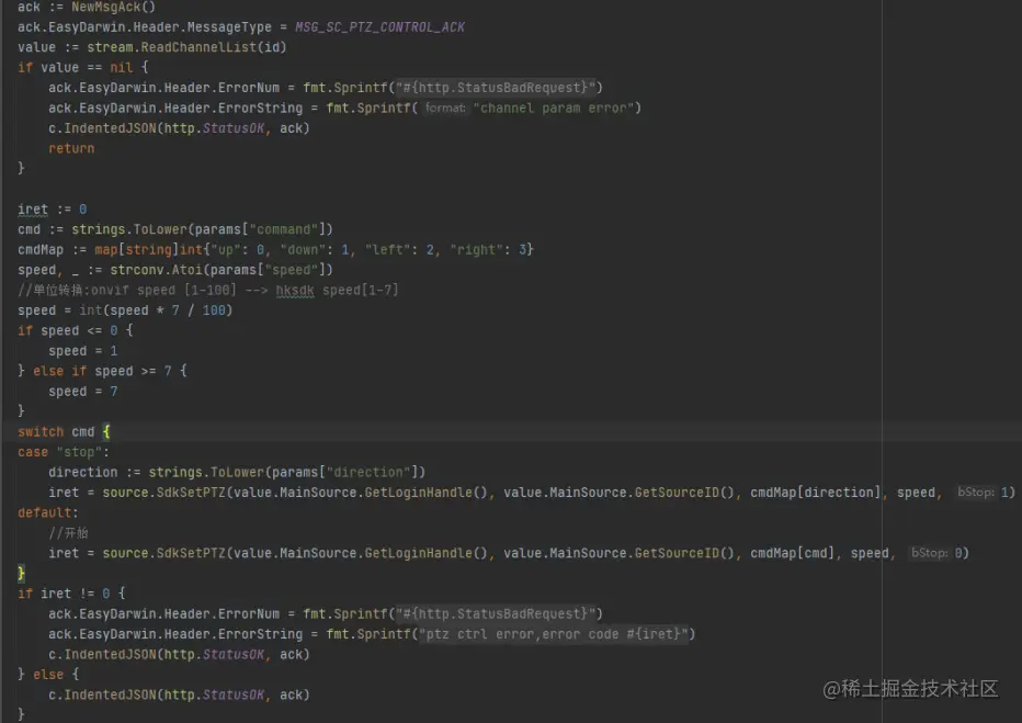 前端接口会传入一个 channelId 过来。从数据库找所匹配的此id,来获取 cgo 传入大华的句柄。前端传 speed 在转换移动速度。调用 SDKSetPTZ 方法来移动大华摄像机云台(以下是 go 移动大华云台的代码)。