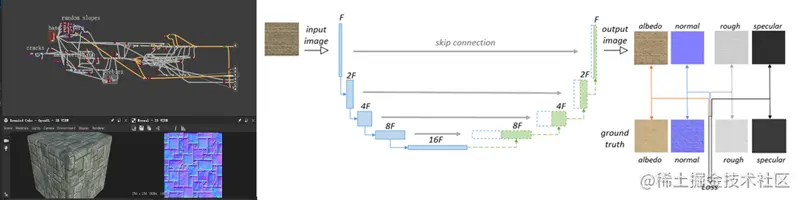 第一种,利用深度学习推理网络,一键生成符合PBR标准的纹理要素,提升纹理制作效率和质量;第二,将技术美术的经验和制作规范固化为遵循PBR标准的数据,通过数据在不同项目和渲染器间复用素材,传承美术制作经验。
