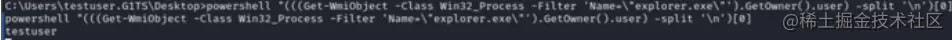 powershell "(((Get-WmiObject -Class Win32_Process -Filter 'Name="explorer.exe"').GetOwner().user) -split '\n')[0]