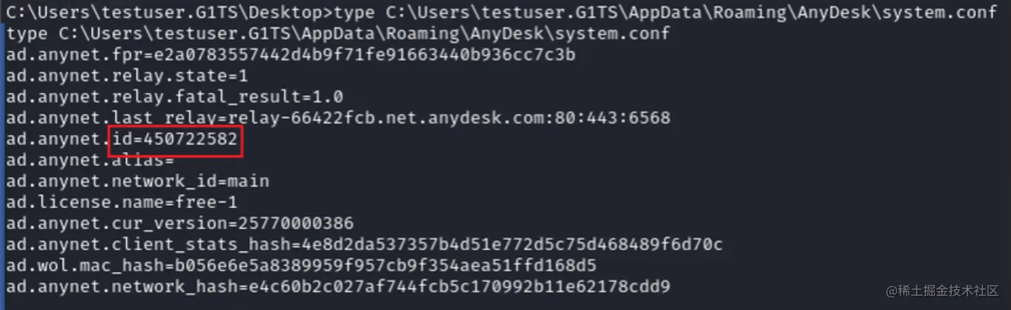 所以我们必须知道目标的ID号才可以连接,所以我们可以在本地生成anydesk的用户配置文件,然后再上传到目标主机,这样不仅知道了目标anydesk的id号,而且使用的还是本地设置的密码