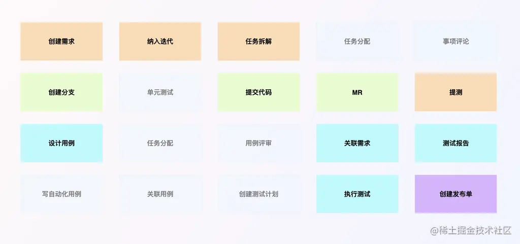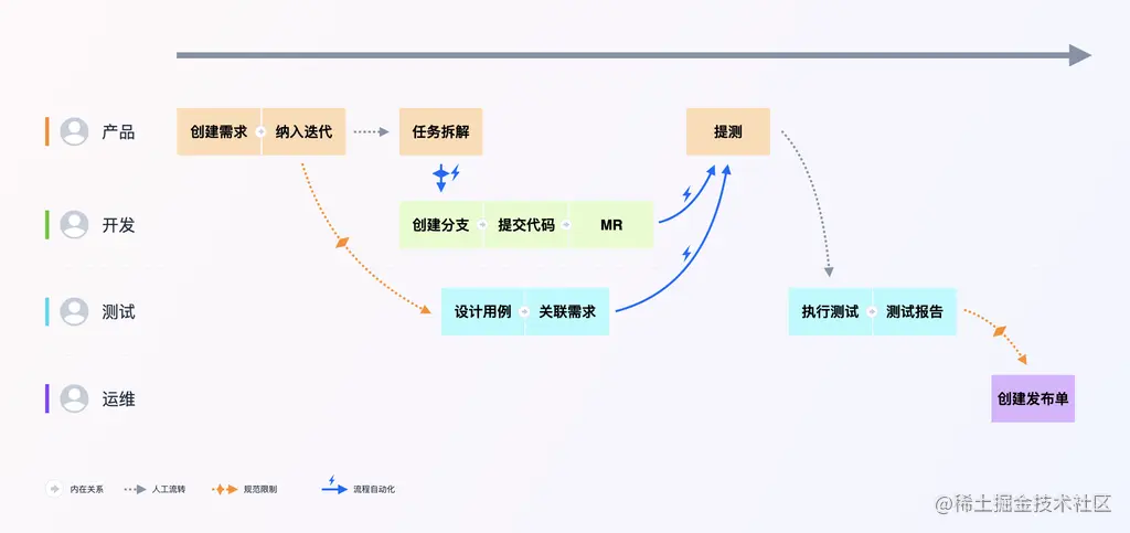 按照不同角色归类好这些活动之后,会发现同一角色的某些活动客观上就是另外一些活动的前提。比如需求被创建出来之后、才有可能被纳入迭代,分支存在之后、才能有对应的代码提交和 MR,用例设计完了、才能在它的基础上关联对应的需求等等。这些内在的关系导致了它们的活动流转必然是自发完成的。