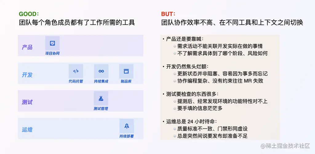 在现有已提供的工具的基础下,团队凭着对 DevOps 的朴素理解,是可以初步协同起来的。但是,用户所面临的协作问题确实存在:比如缺乏跨职能活动的能力拉通,活动之间的协作规范缺失,难以识别研发过程中的风险,个体在工作中需要理解的上下文过多,还有跨职能的许多操作只能手工处理等等。这些看上去琐碎,但是这些问题累积起来迟迟得不到解决,便会造成团队成员极大的“心力损耗”,甚至导致了优秀员工对打造高效组织产生怀疑。