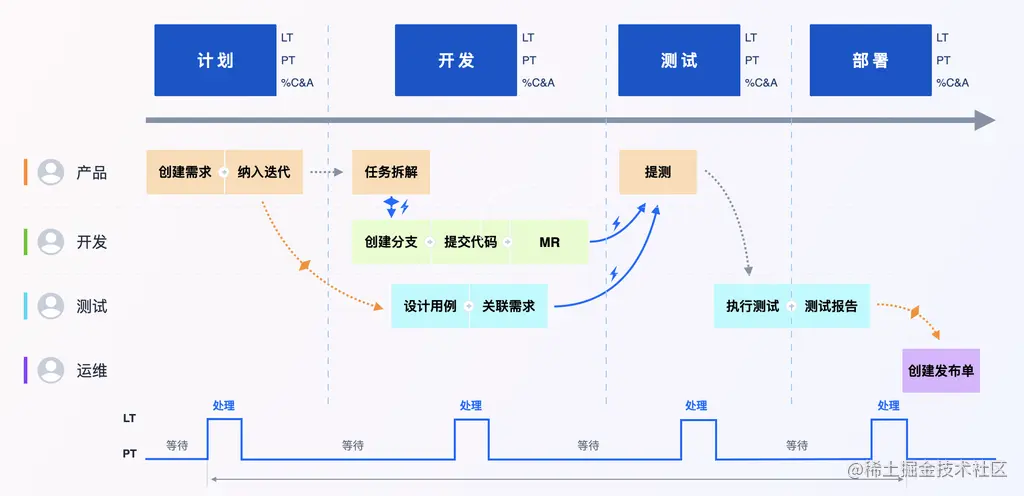 规范和自动化能够产生精确的活动记录,从而为效率度量提供真实可靠的数据,进行有效的洞察诊断和指导改进。比如前置时间和处理时间的差异、任务完成率/准确率等等。这是价值流管理(Value Stream Management)的基础。