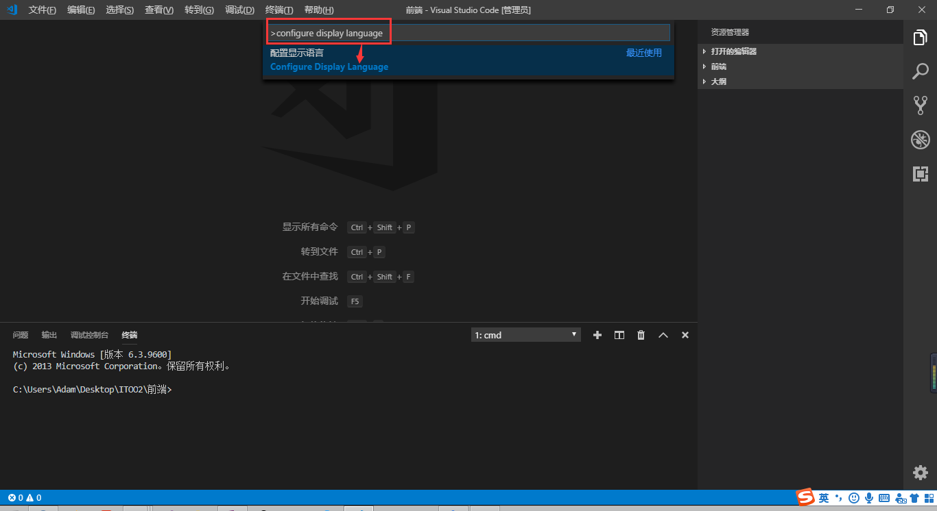 VsCode设置中文 Adam南帝梁 2021-11-15 744 阅读1分钟 前言: VsCode是前端开发使用比较广的工具,但是英文对我们的小伙伴似乎不是很友好,那么怎么将VSCode设置成中文呢? 下载语言包: 在插件中搜索Chinese,选择第一个,并点击Install 安装完成后不着急重启 设置语言: ·Ctrl+Shift+P打开命令搜索 ·在输入框中搜索:configure display language 并打开 修改locale.json 文件:"zh-CN" 重启VSCode! 大功告成!