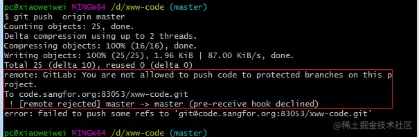 解决方法: 原因是默认master分支设置成保护分支,不允许普通开发人员直接推送代码 ,也不允许强制推送代码.