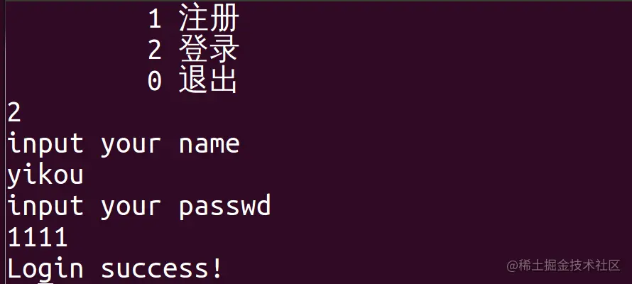 输入选项2,输入刚才注册的用户名密码,如果不一致会提示错误