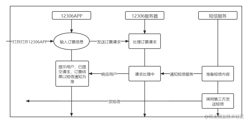 处理订票请求是一个漫长的过程,需要检查预定的车次是否有预定数量的票,下单扣库存,更新缓存等一系列操作。这些耗时的操作,我们可以通过使用消息队列的方式,把提交请求成功的消息告诉用户。然后异步处理这些耗时的操作,保证30min内能把处理的结果通过短信推送给用户,否则系统处理多久,用户就会等多久。