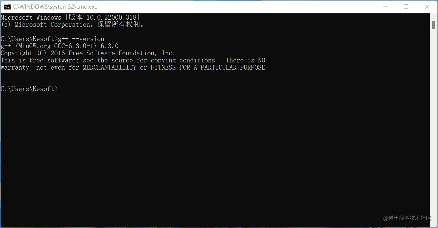 若在cmd中输入g++ --version提示以下结果,则安装成功