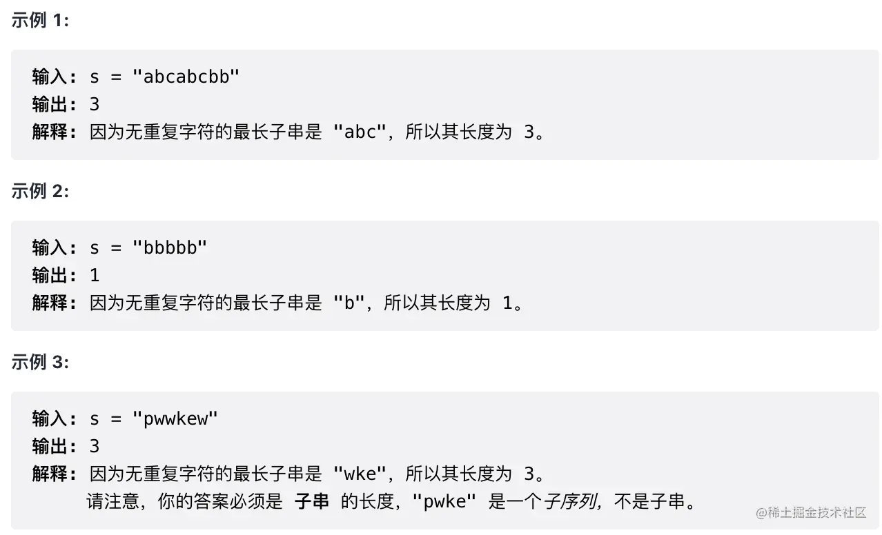 给定一个字符串s,请你找出其中不含有重复字符的 最长子串 的长度。