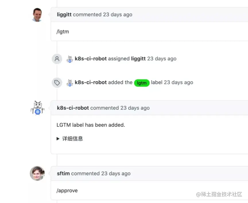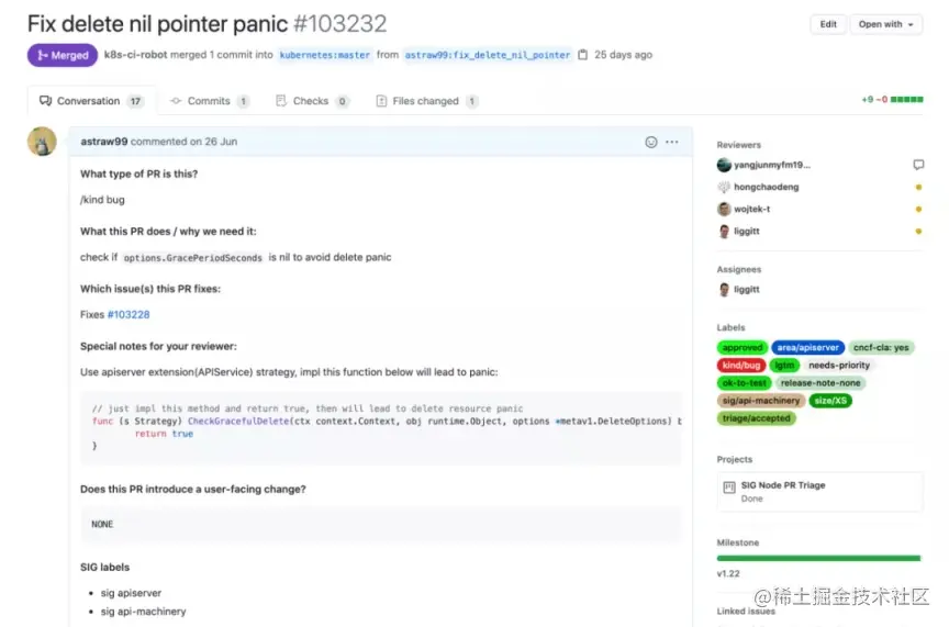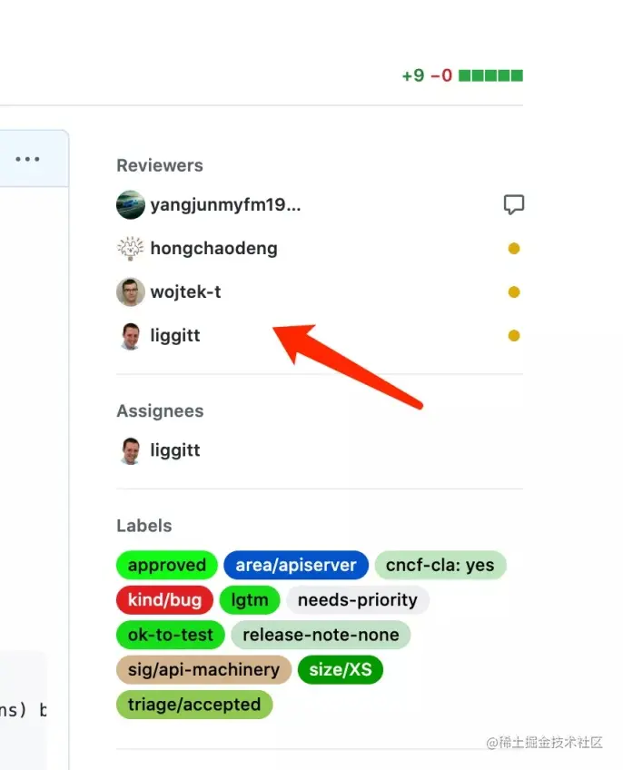 此时,其他 K8s member 也可以主动参与此 PR review,右上角 Reviewers 里面就会看到所有人员,包括机器人默认分配的两个 Reviewer,以及其他主动参与的 Reviewer。