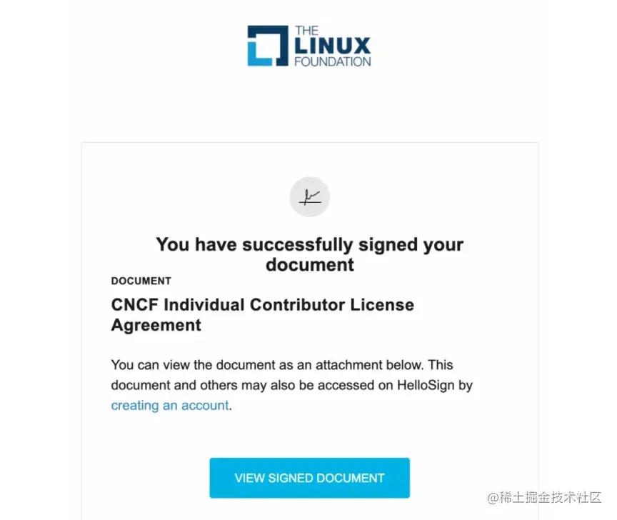 此时,就需要根据链接指引,去 https://identity.linuxfoundation.org/ 签订协议,注册建议选择 Log in with GitHub 可以直接获取到 GitHub username,与上一步 PR git commit author 保持一致。按提示填写相关签约信息后,将收到正式的签约成功邮件,如下: