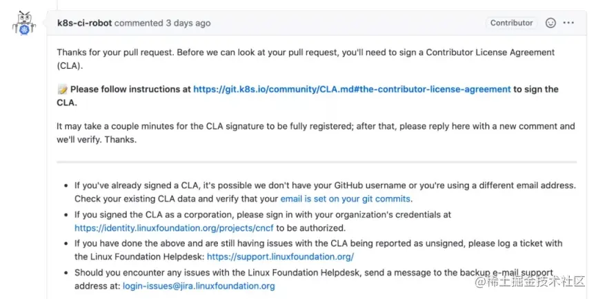 如果是第一次提交 K8s PR,则会收到机器人推送的签协议评论,如下:
