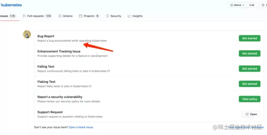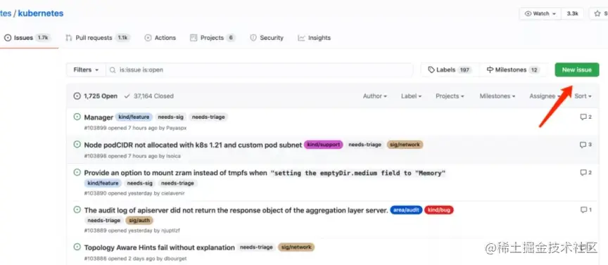或在工作实践中偶然遇到了一个 K8s bug,第一步应该到官方 issues (https://github.com/kubernetes/kubernetes/issues) 下面查询一下,是否其他人已经提过相关或相同的 issue 了,如果没有查到相关 issue,那么就可以点击页面右上角 "New issue" 创建一个新 issue。