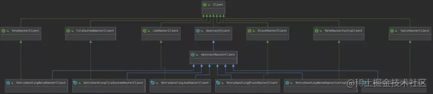 Client 接口抽象定义 Alluxio 中 Client 操作,其继承和实现类如下所示,封装了对接各个组件的 RPC 接口: