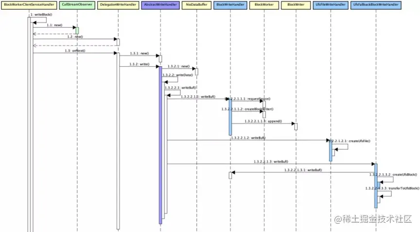 BlockWorkerClientServiceHandler.writeBlock 方法定义 Block 写入,默认创建请求参数 StreamObserver responseObserver 创建 CallStreamObserver;若支持零拷贝,则使用 BlockWorkerClientServiceHandler;