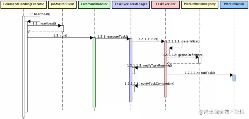 由前文 AlluxioJobWorker 启动流程可知,AlluxioJobWorker 启动时会触发心跳检测线程 CommandHandlingExecutor,对接收到的作业执行调度处理,每个作业启动一个线程执行,作业执行大致流程如下: