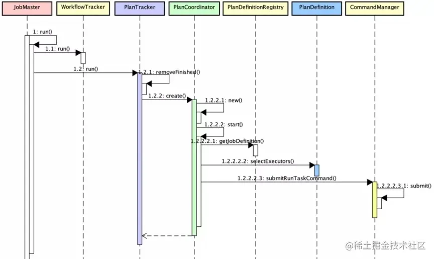 外部接口可调用 JobMaster.run 方法触发作业执行,以 Plan 作业类型为例,调用 PlanTracker 执行 run 方法;