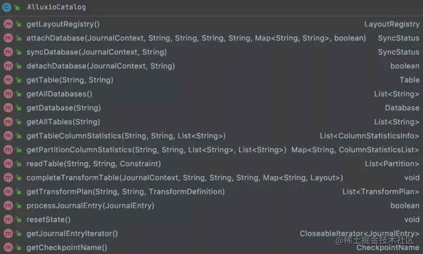 AlluxioCatalog 进行 Alluxio 中 Catalog 管理对象,封装和维护了 Alluxio 中注册的 DB 信息及各个 DB 下的 Table 等元数据信息,其基本的方法操作如下,包括:获取数据库 db 信息,db 元数据同步,db 绑定/解绑等操作。