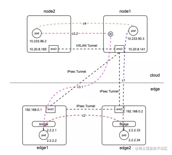 - 边缘 POD 访问云端的 POD, 比如 c3(紫色虚线), 流量从 pod 发出,经过网桥,经过路由,iptables 规则,xfrm 策略,进入 IPSec 隧道,到达云端 Connector 节点,再经过一次路由转发,使用 Flannedl 的 VXLAN 隧道,到达目标节点 node2,到达目标 pod。