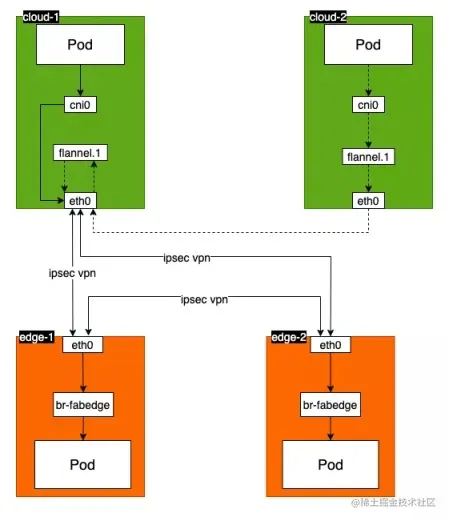 由于 edge-1 和 edge-2 在同一个 community,FabEdge 会在节点之间建立 ipsec vpn 隧道,边缘节点 pod 之间的请求,会通过 ipsec vpn 隧道进行转发。