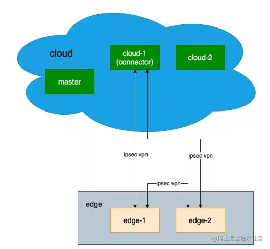在 SuperEdge 边缘独立集群中添加 4 个节点,2 个节点(cloud-1 和 cloud-2)在云端和 master 节点在同一内网,2 个节点(edge-1 和 edge-2)在边缘端。将 cloud-1 节点作为 connector 节点,将 edge-1 和 edge-2 加入 community。具体的搭建过程,请参照 FabEdge 文档[1]。