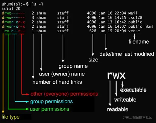 接下来的字符中,以三个为一组,且均为 rwx 的三个参数的组合。其中, r 代表可读(read)、 w 代表可写(write)、 x 代表可执行(execute)。 要注意的是,这三个权限的位置不会改变,如果没有权限,就会出现减号 - 而已。