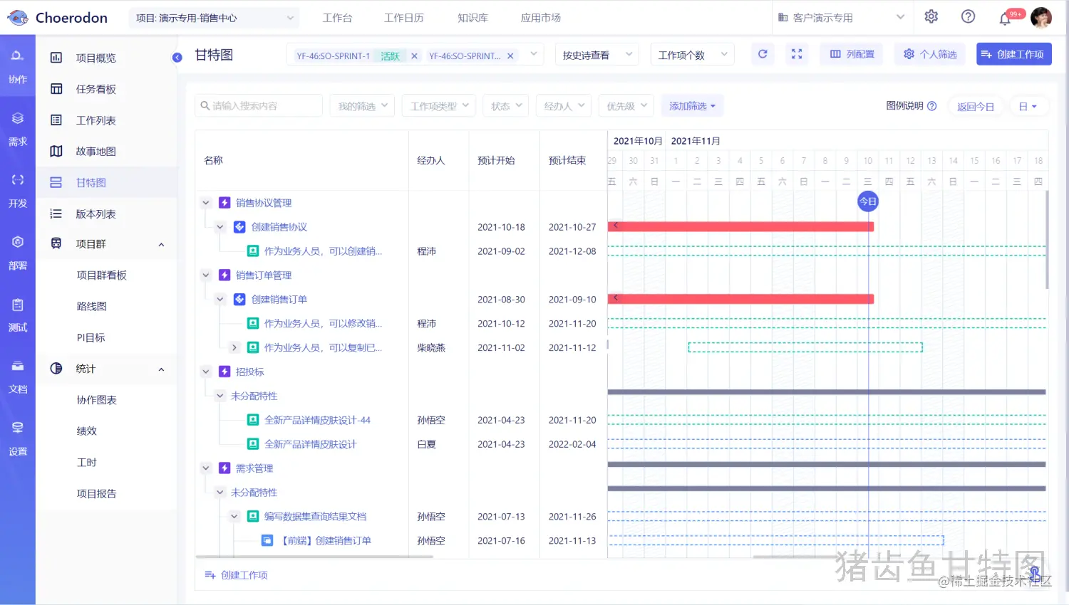 - 在猪齿鱼的组织层也增加了甘特图功能,并且显示资源冲突,帮助管理者合理规划组织资源,提高组织团队的资源利用率