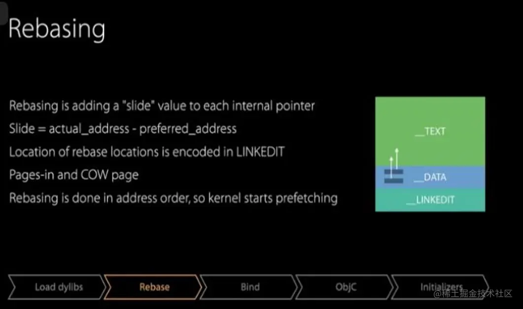 在dylib的加载过程中,系统为了安全考虑,引⼊了ASLR (Address Space Layout Randomization)技术和 代码签名。由于ASLR的存在,镜像(Image,包括可执⾏⽂件、 dylib和bundle)会在随机的地址上加载,和 之前指针指向的地址(preferred_address)会有⼀个偏差(slide), dyld需要修正这个偏差,来指向正确的 地址。 Rebase在前, Bind在后, Rebase做的是将镜像读⼊内存,修正镜像内部的指针,性能消耗主要在 IO。 Bind做的是查询符号表,设置指向镜像外部的指针,性能消耗主要在CPU计算。
