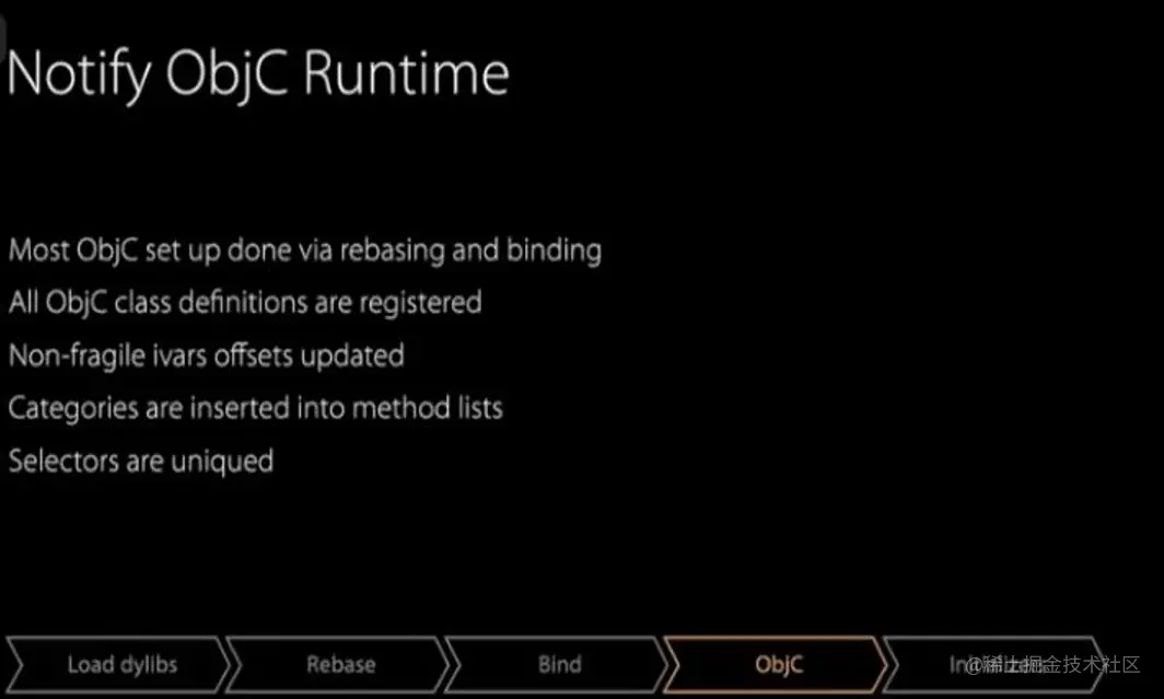 ⼤部分ObjC初始化⼯作已经在Rebase/Bind阶段做完了,这⼀步dyld会注册所有声明过的ObjC类,将分类插 ⼊到类的⽅法列表⾥,再检查每个selector的唯⼀性。