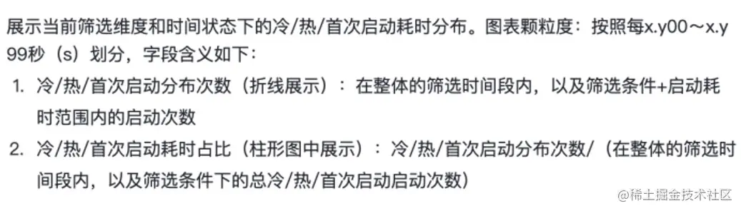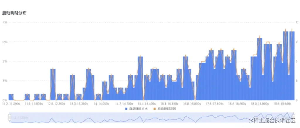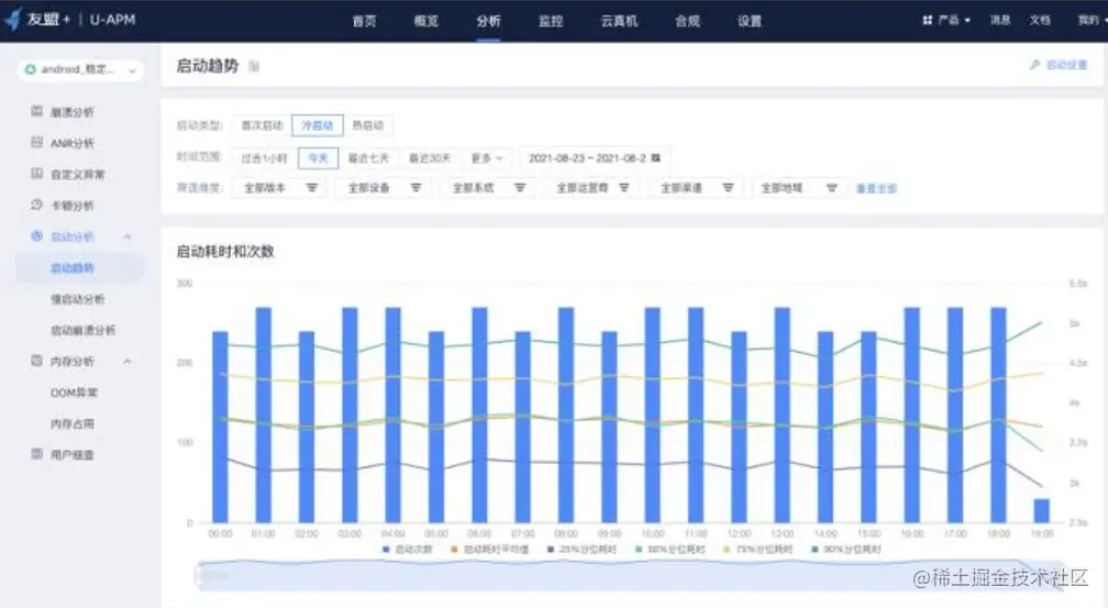 当然我们可以通过服务器埋点上报的⽅式⾃⾏统计分析,不过这样⼀来会发现我们的统计成本就会⼤⼤增 加,⽽且结果分析也会变得不那么灵活。所以这⾥推荐⼀种简单的监控⽅式,那就是友盟的 U-APM 应能性 能监控SDK ,只需要我们进⾏简单的pod集成之后,便可根据我们的实际需要进⾏⼿动或者⾃动监控启动数 据,详情可以参考 U-APM, 并且为了⽅便我们对数据进⾏分析,友盟后台已经根据这些数据帮我们绘制出 了对应的分布图,我们可以⼀⽬了然的得出启动耗时分布、启动类型占⽐等等,如图: