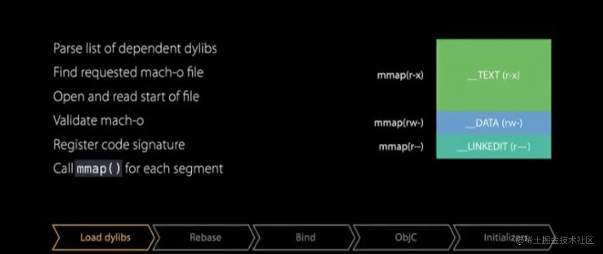 这⼀阶段dyld会分析应⽤依赖的 dylib (xcode7以后.dylib已改为名.tbd),找到其 mach-o ⽂件,打开和读取这些⽂件并验证其有效性,接着会找到代码签名注册到内核,最后对 dylib 的每⼀个 segment 调⽤ mmap()。不过这⾥的 dylib ⼤部分都是系统库,不需要我们去做额外的优化。