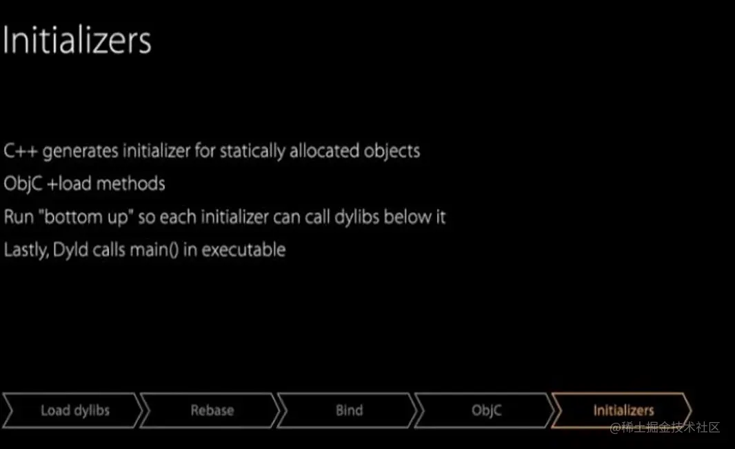 在这⼀阶段, dyld开始运⾏程序的初始化函数,调⽤每个Objc类和分类的+load⽅法,调⽤C/C++ 中的构造器 函数(⽤attribute((constructor))修饰的函数),和创建⾮基本类型的C++静态全局变量。 Initializers阶段执⾏ 完后, dyld开始调⽤main()函数。