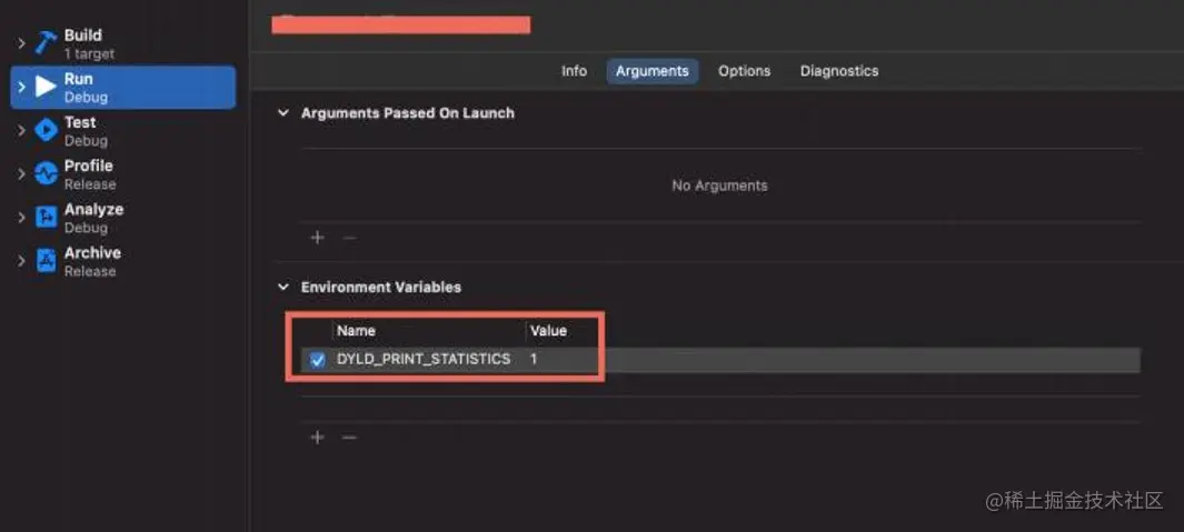 另外如果在开发过程中,我们想直观的查看 app 启动期间,各阶段的耗时情况,也可以在Xcode,的 edit scheme 设置添加 DYLD_PRINT_STATISTICS 为1 ,打印启动时⻓,例如