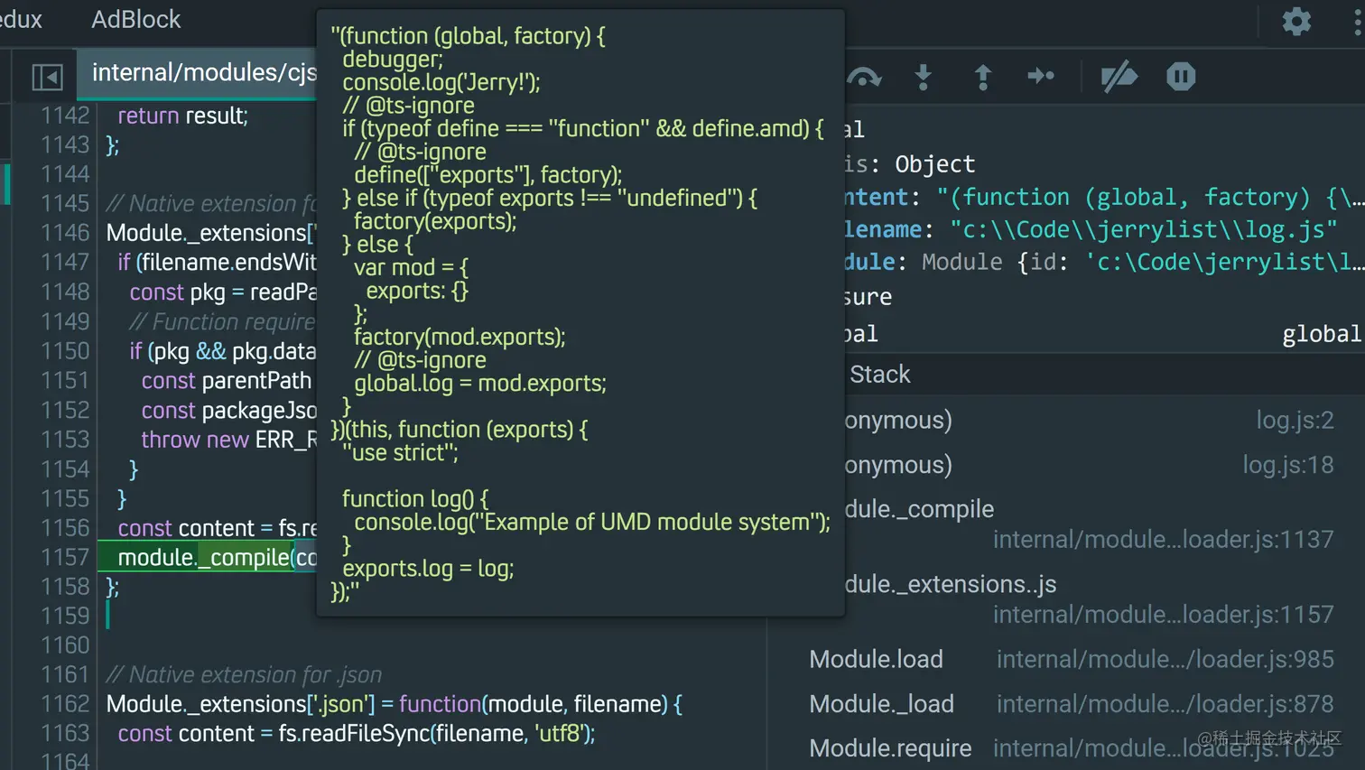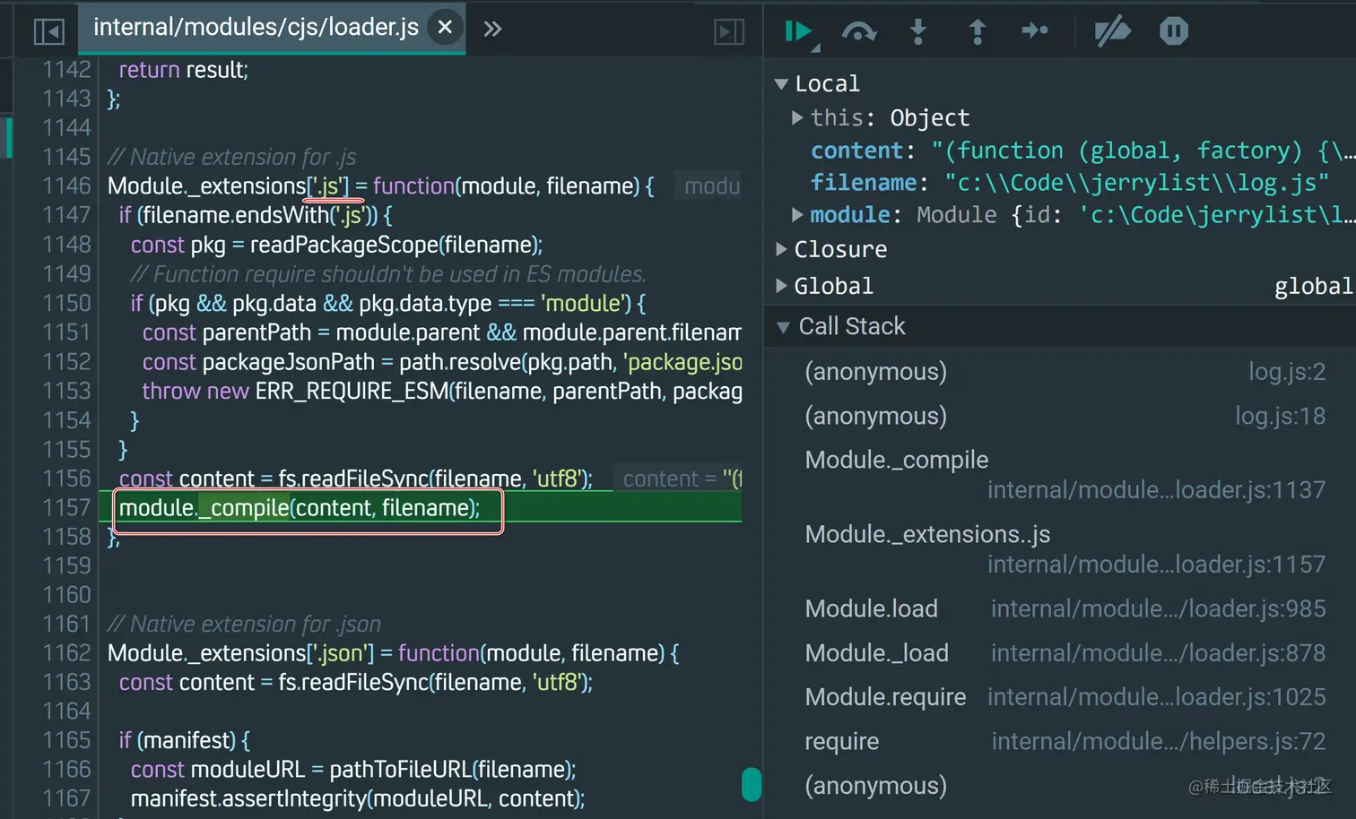 第 1157 行的代码位置,变量 content 的内容就是 log.js 文件的内容: