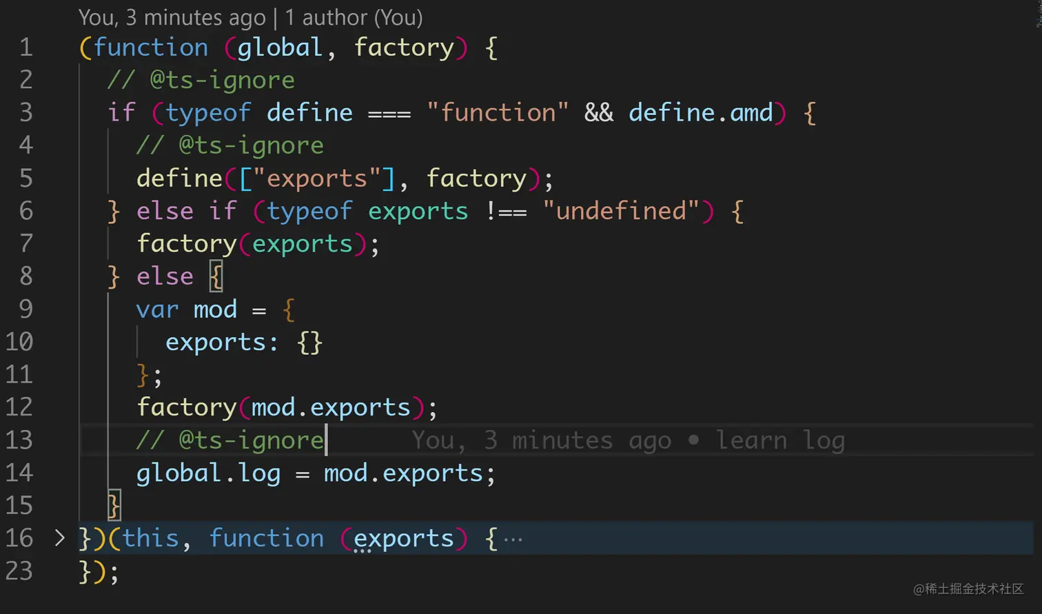 上图是一个自执行函数,两个输入参数 global 和 factory 分别传入了 this 和 function(exports)...