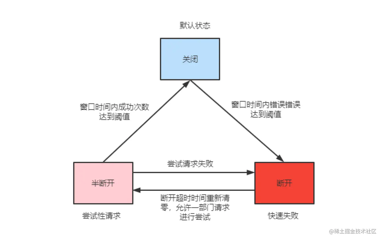 - 关闭:默认状态,请求能被到达目标服务,同时统计在窗口时间成功和失败次数,如果达到错误率阈值将会进入断开状态。