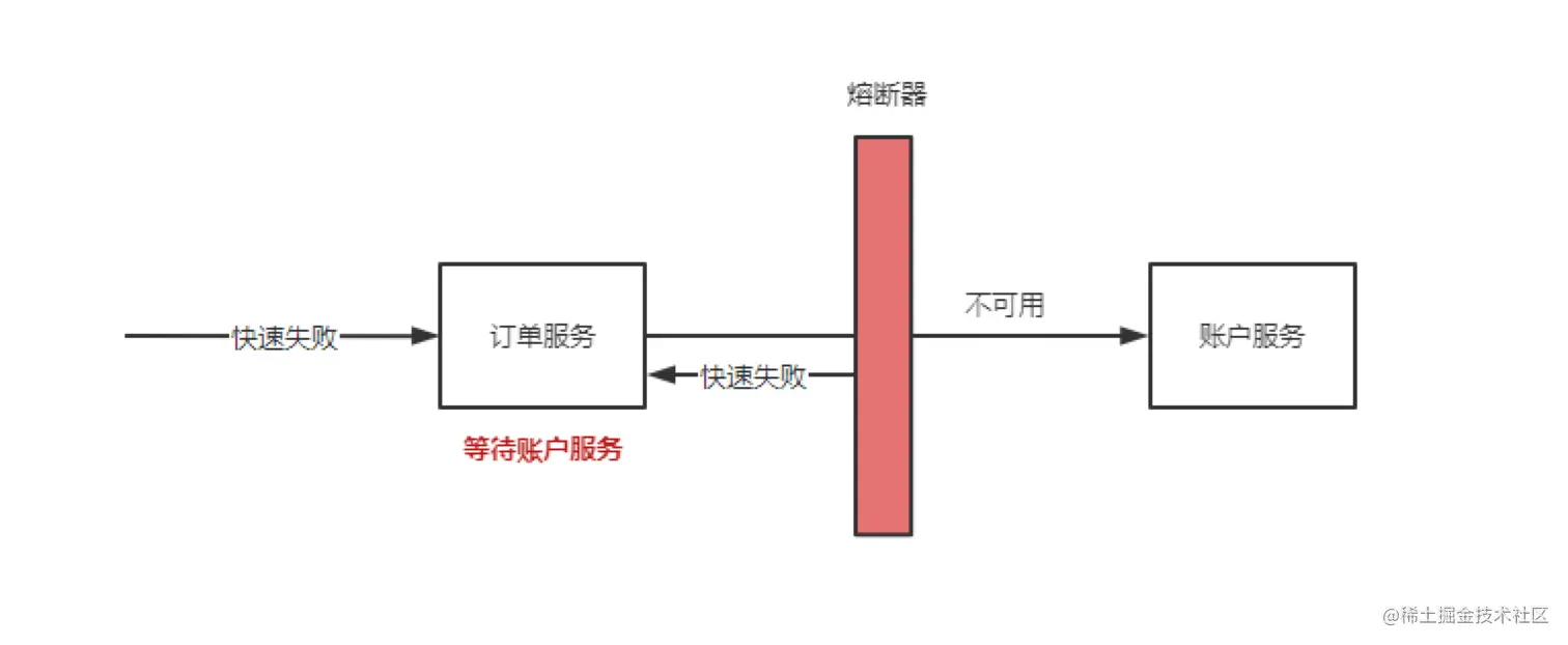 假如此时 账户服务 过载,订单服务持续请求账户服务只能被动的等待账户服务报错或者请求超时,进而导致订单请求被大量堆积,这些无效请求依然会占用系统资源:cpu,内存,数据连接...导致订单服务整体不可用。即使账户服务恢复了订单服务也无法自我恢复。