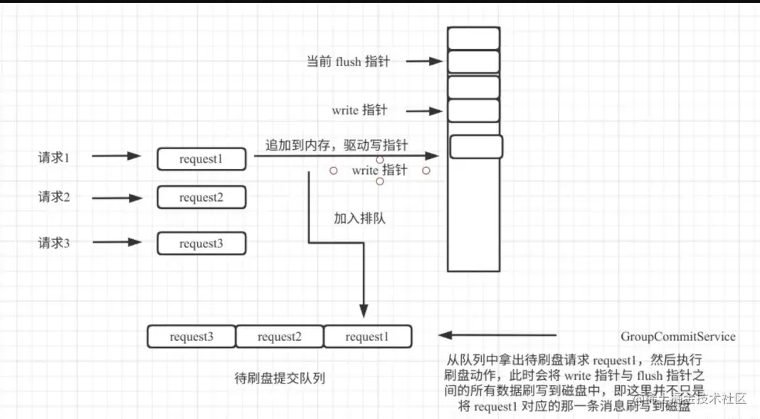 同步刷盘在 RocketMQ 的实现中成为组提交,并不是每一条消息都必须刷盘。其设计理念如图所示: