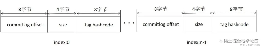 Consumequeue 的设计极具技巧,每个条目长度固定(8 字节 commitlog 物理偏移量、4 字节消息长度、8 字节 tag hashcode)。