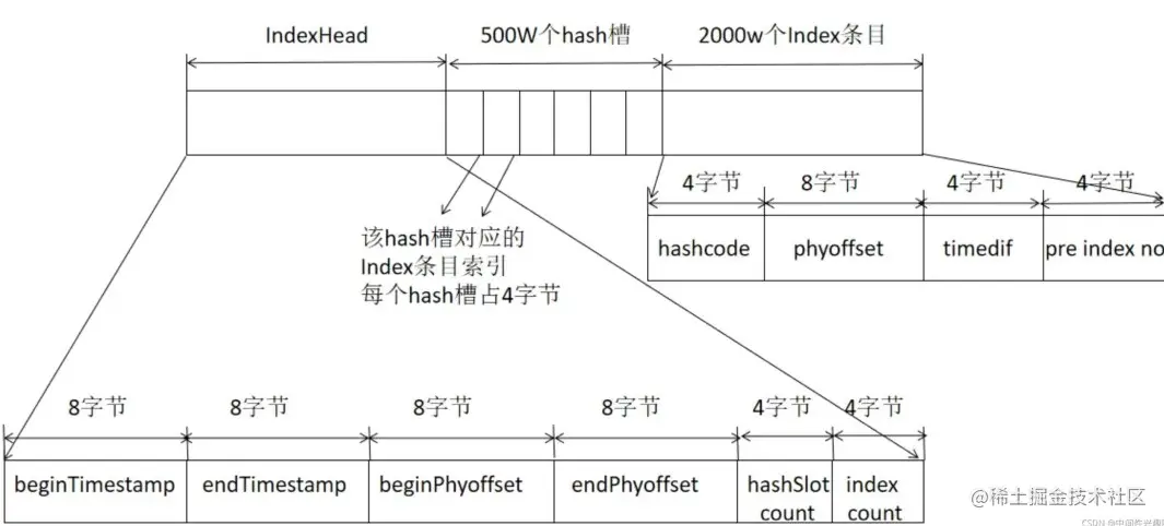 RocketMQ 引入了 Index 索引文件,实现基于文件的哈希索引。IndexFile 的文件存储结构如下图所示: