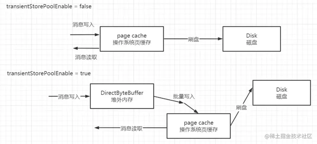 RocketMQ 为了降低 pagecache 的使用压力引入了 transientStorePoolEnable 机制,即内存级别的读写分离机制。