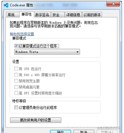 - 在win7电脑,右键—>兼容性—>兼容模式下运行—>重新启动vscode,如下图所示: